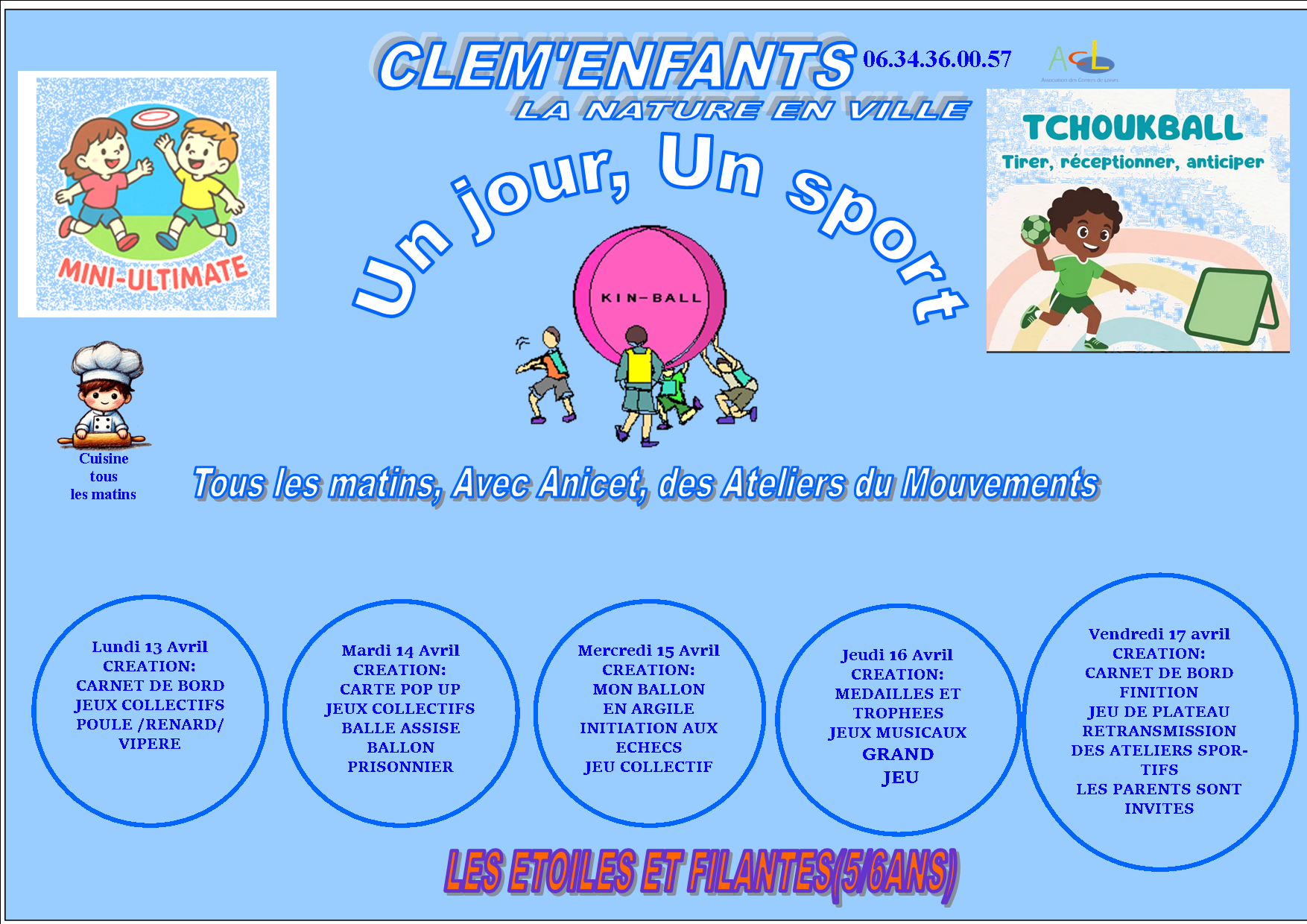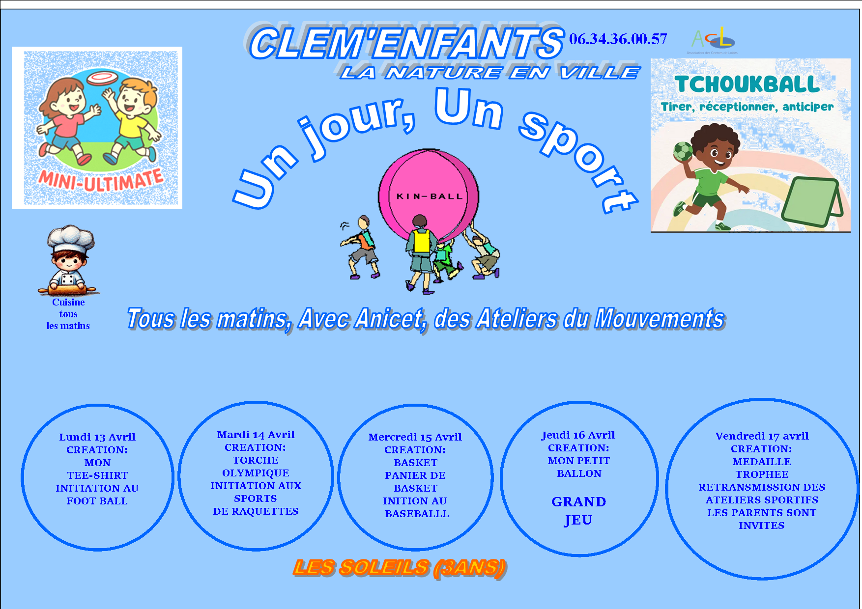 “Un jour un sport” animé par l’association Les Ateliers du Mouvement. Chaque jour, les enfants vont pouvoir s’initier et découvrir de nouveaux sports