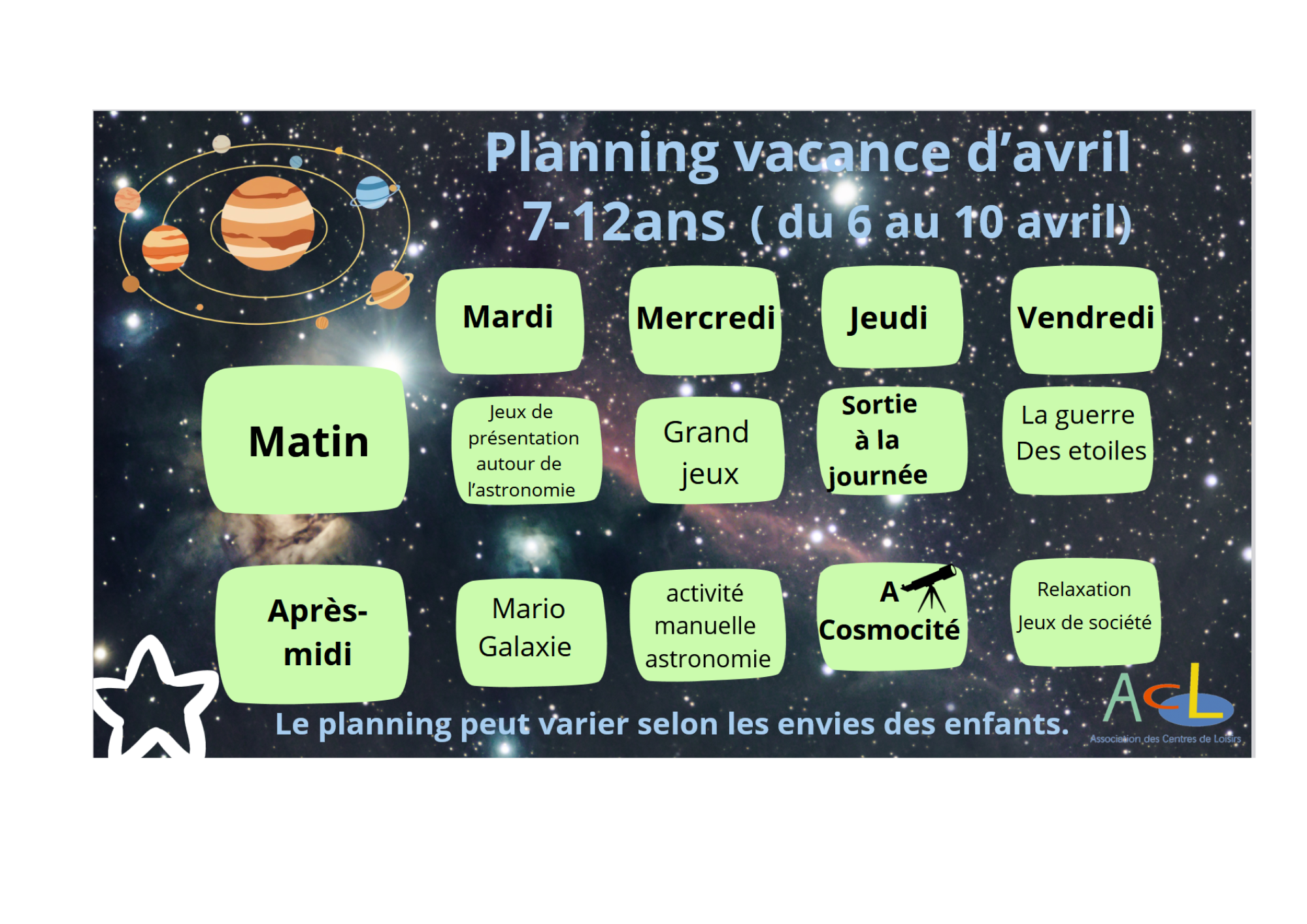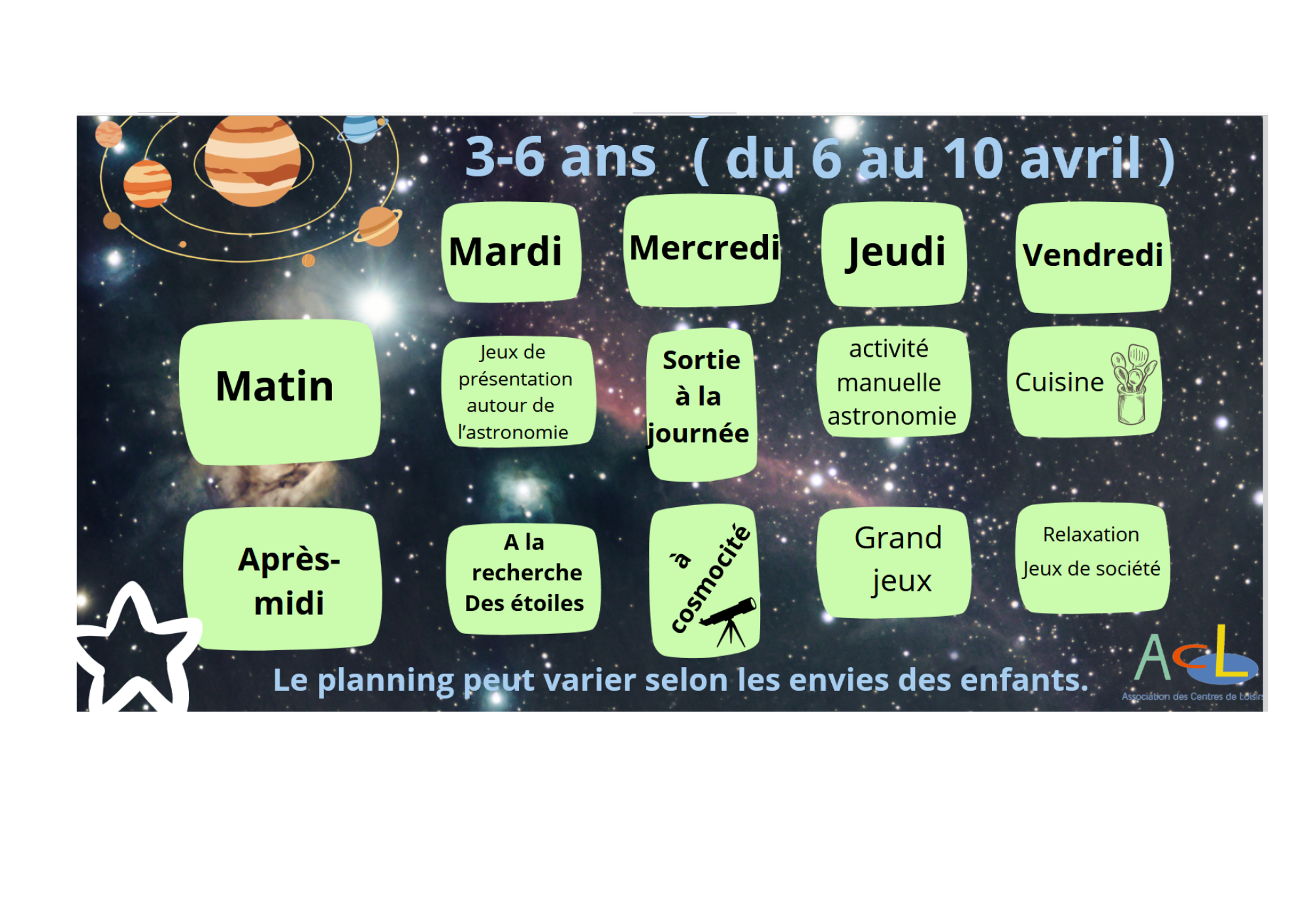Les enfants découvriront tout au long de la semaine l’astronomie. Installation d’un planétarium le vendredi pour partir à la découverte du système solaire. Une sortie à Cosmocité sera également proposée le mercredi. Pour aller plus loin dans cette thématique, un atelier scientifique est proposé en formule stage les mardi jeudi et vendredi en inscription limitée. De plus, une patinoire synthétique du Club de Hockey sur glace des Brûleurs
