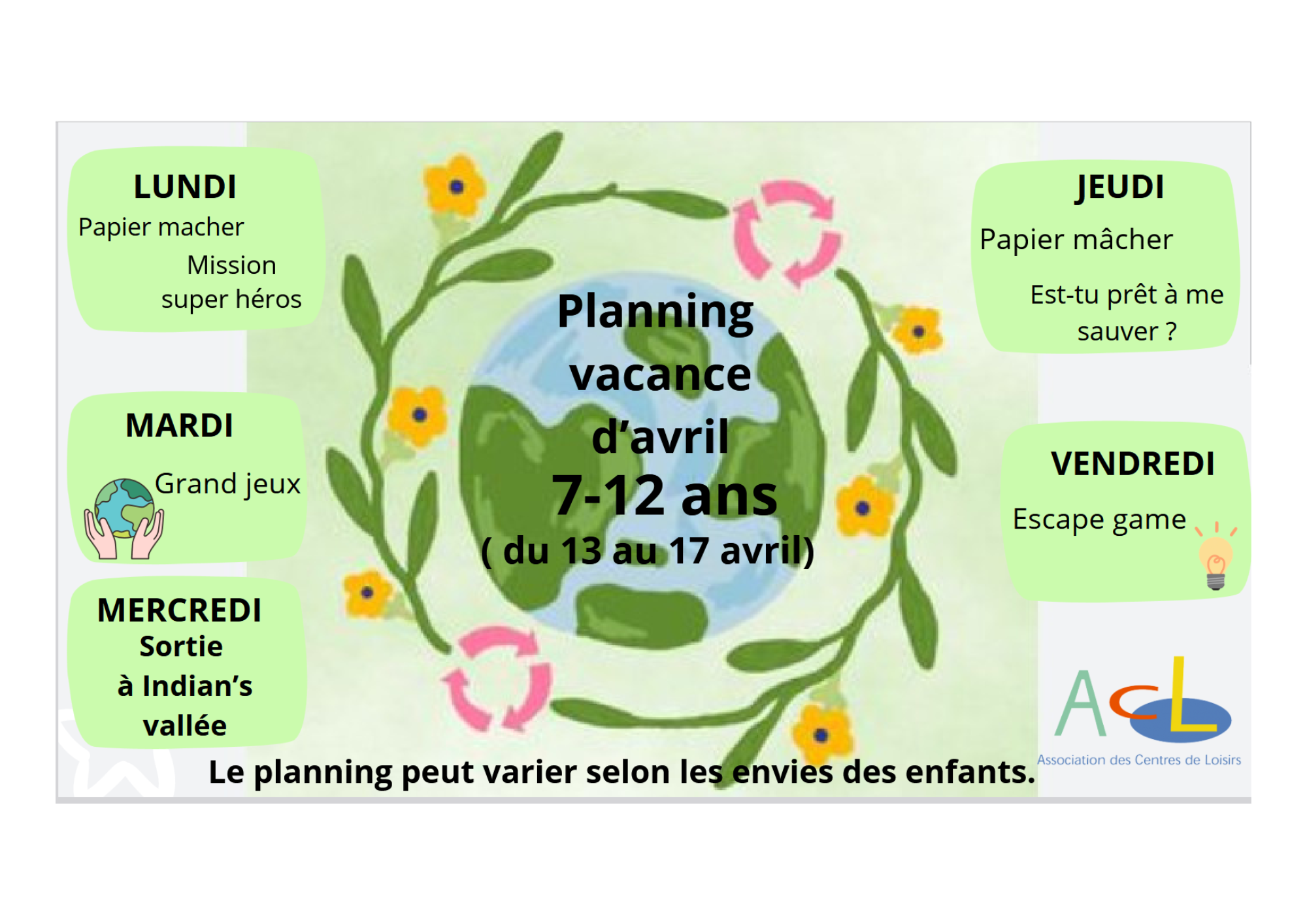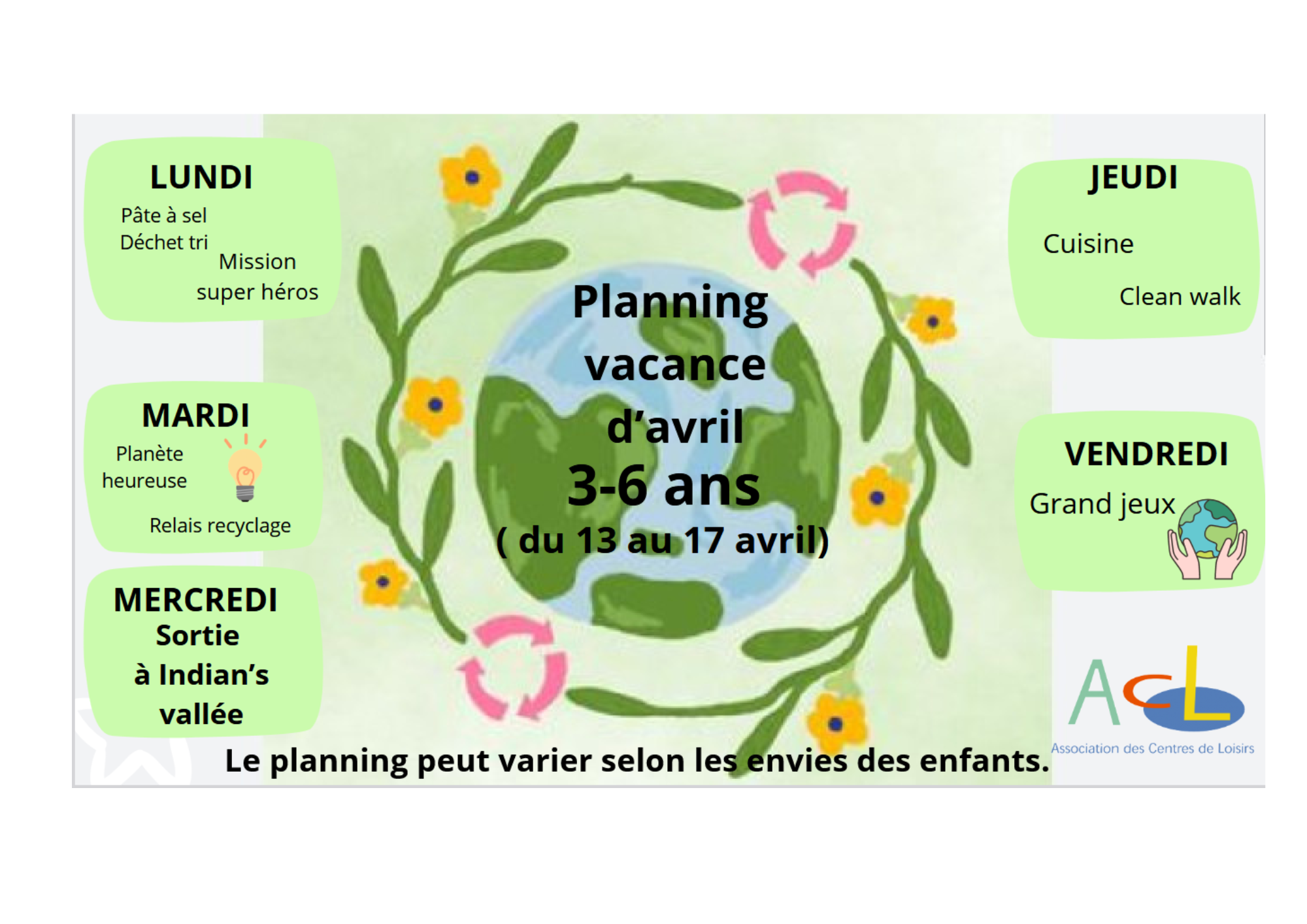 L’équipe propose et organise des animations en lien avec le développement durable, l’épanouissement de l’enfant et la vie en collectivité. C’est un espace de vie, un lieu d’apprentissage avec au programme des animations ludiques et variées; activités manuelles, culturelles et sportives à travers des semaines à thèmes.