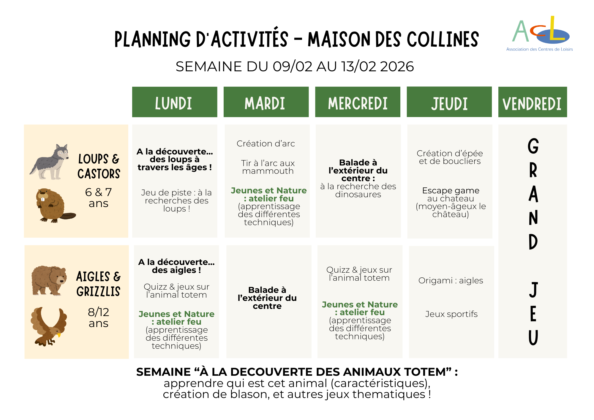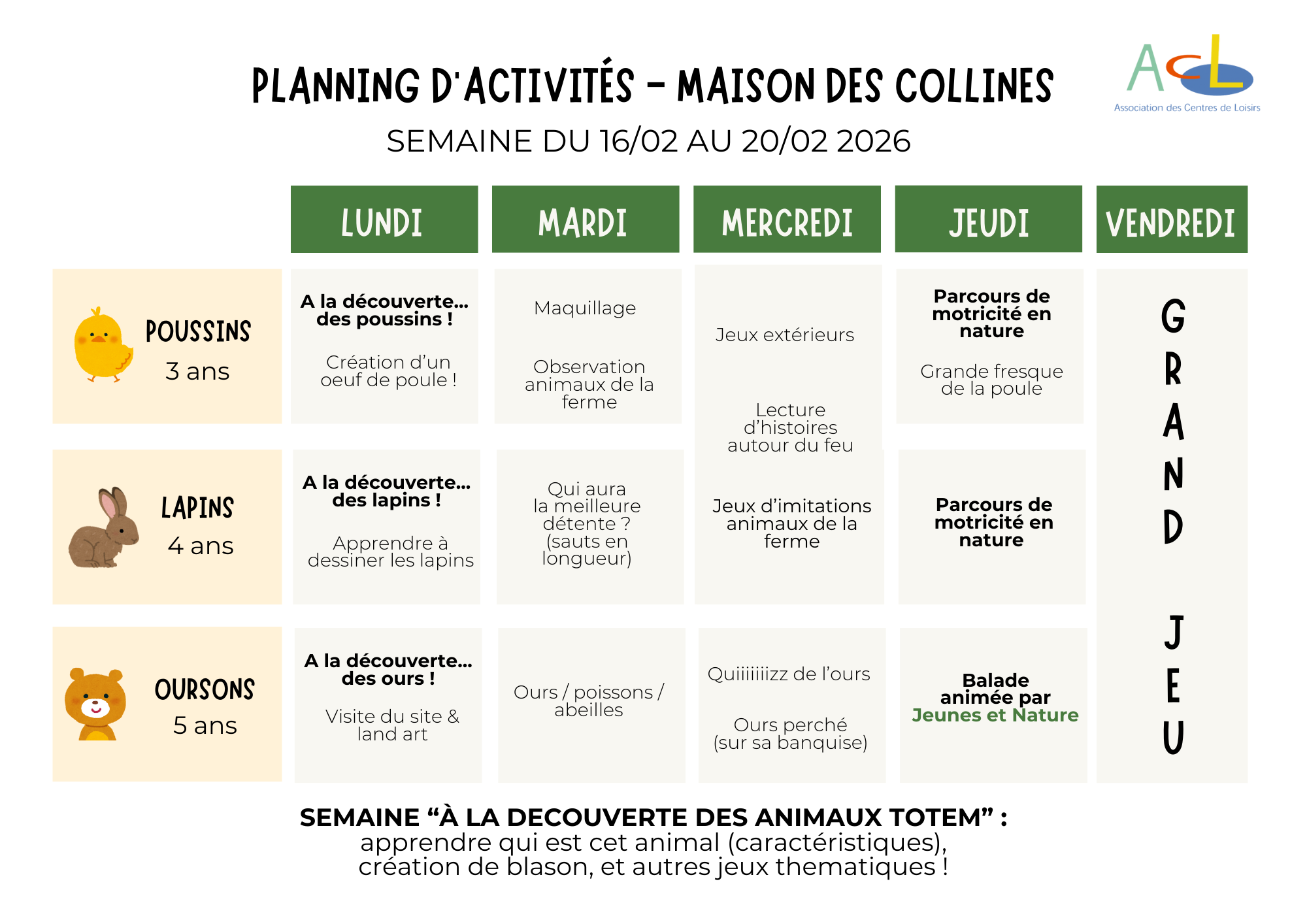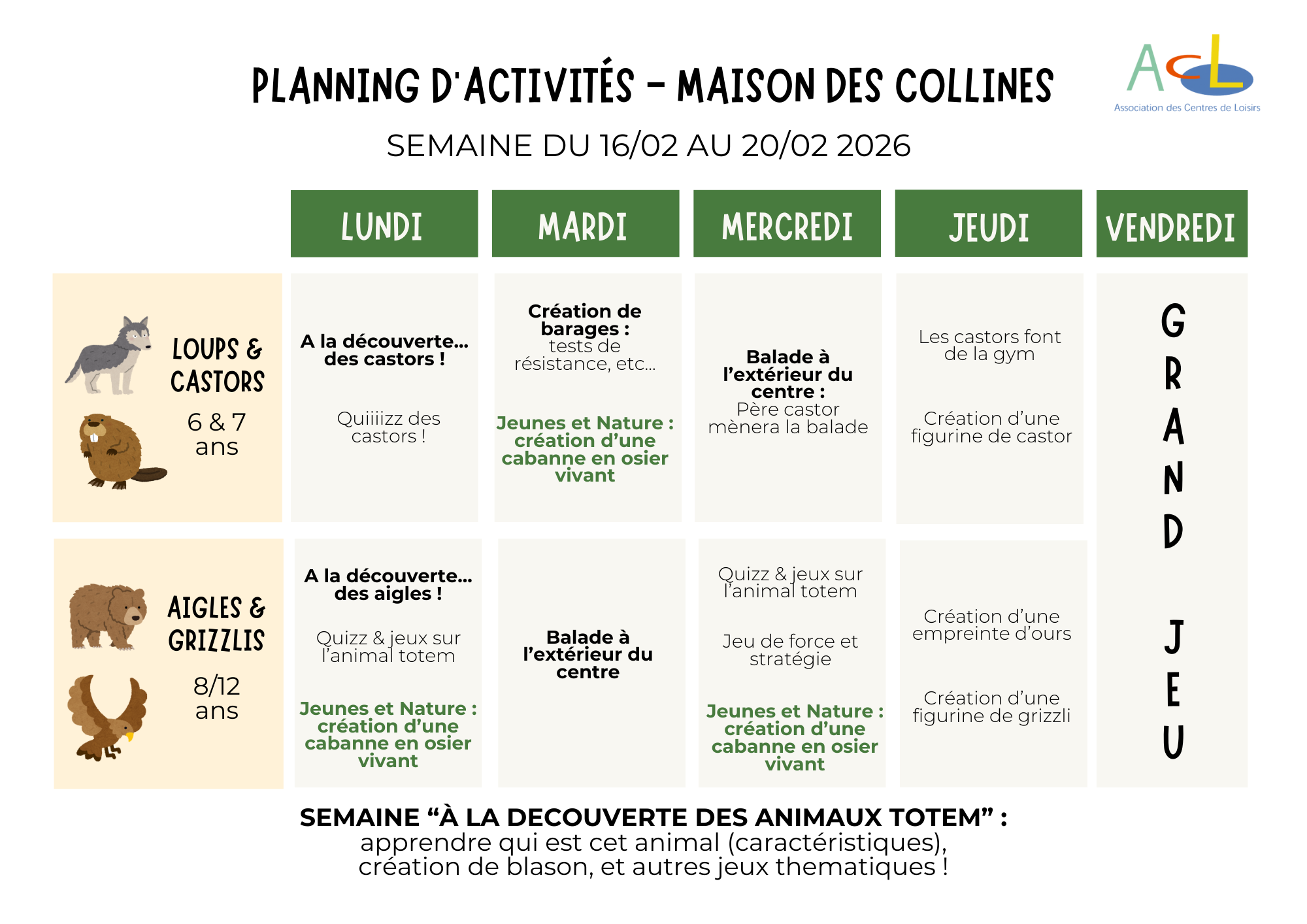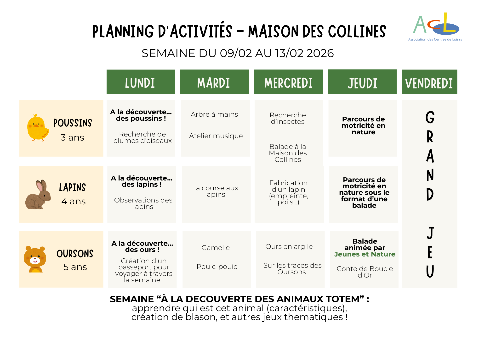 Chaque jour, les enfants choisissent entre plusieurs ateliers qui leur permettent de créer un lien avec leur environnement naturel. Des randonnées en forêt sont prévues afin de s’immerger le plus possible dans la nature. L’équipe d’animation propose des animations variées pour correspondre aux attentes de chacun. Les enfants évoluent par groupes d’âge pour respecter leurs rythmes et leurs besoins. Durant les vacances, les intervenants de l’association «Jeunes et Nature» renforcent l’aspect technique des activités spécifiques, Maire Odille, plasticienne anime un atelier d’arts plastiques pendant les vacances et ainsi développe la créativité des enfants.