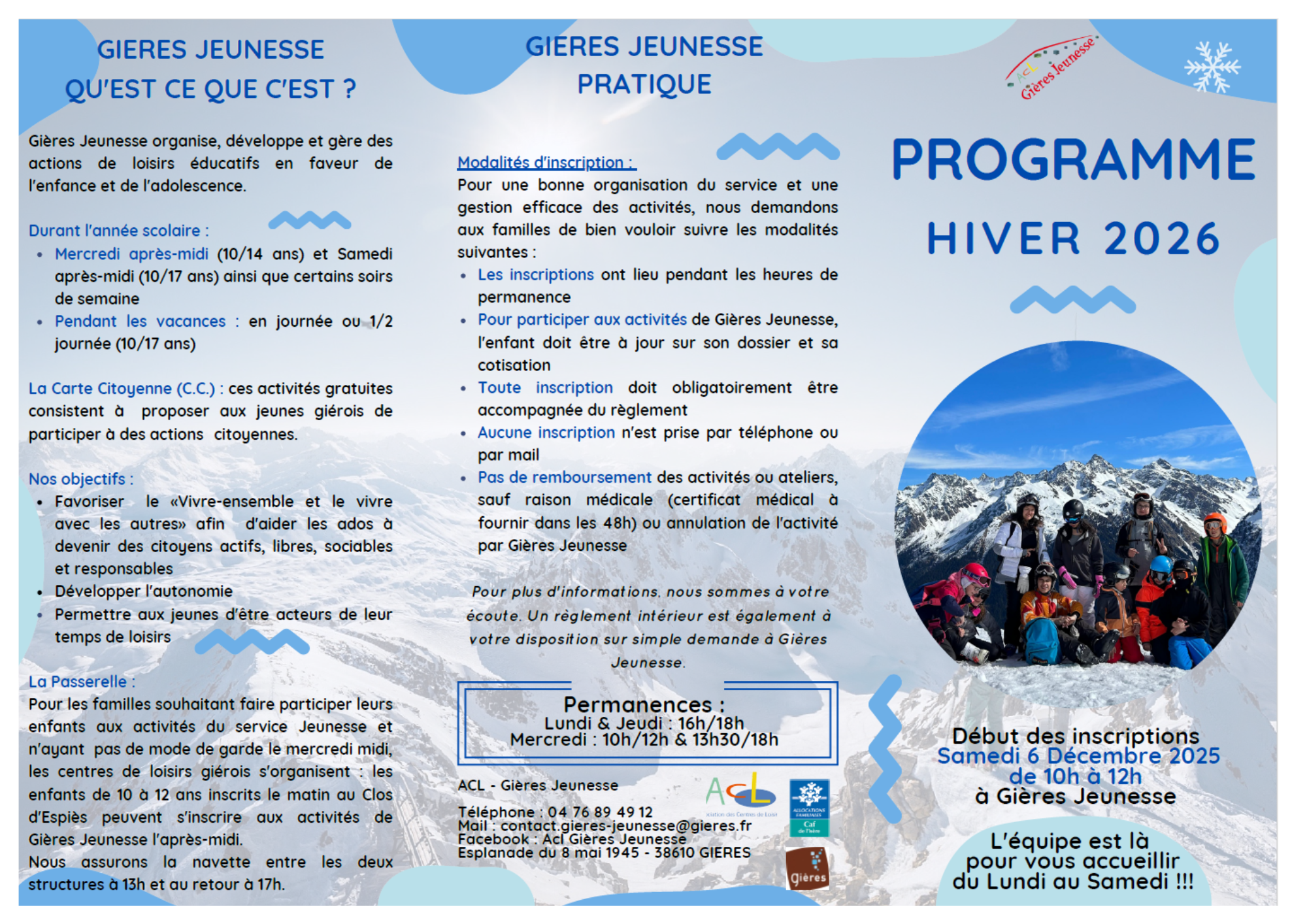 Inscriptions uniquement à Gières Jeunesse. Informations et horaires sur notre site internet.