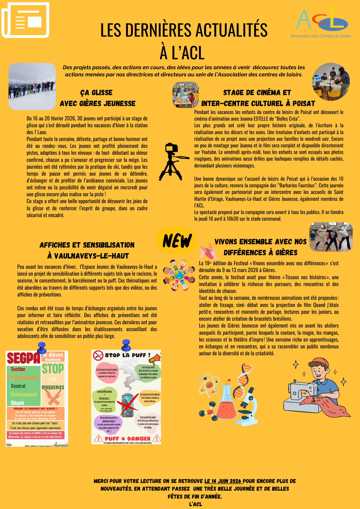 Bonjour à tous.tes, dans cette édition de la première Newsletter de l’année 2026 vous trouverez : Une présentation des sorties ski loisirs de Gières Jeunesse, les projets dynamiques sur Poisat avec le stage de cinéma ainsi que l’intercentre convivial proposé par l’accueil de loisirs. Ensuite une présentation des affiches réalisées par les jeunes de l’Espace jeune de Vaulnaveys-Le-Haut afin de sensibiliser à des sujets tels que les moqueries, l’égalité ou encore la « puff ». Enfin, toujours dans cette dynamique de collectif et de respect vous trouverez la présentation du festival de Gières, : Vivre ensemble avec nos différences, piloté avec Gières Jeunesse et mettant en avant les ateliers menés et auxquels participent les  jeunes.