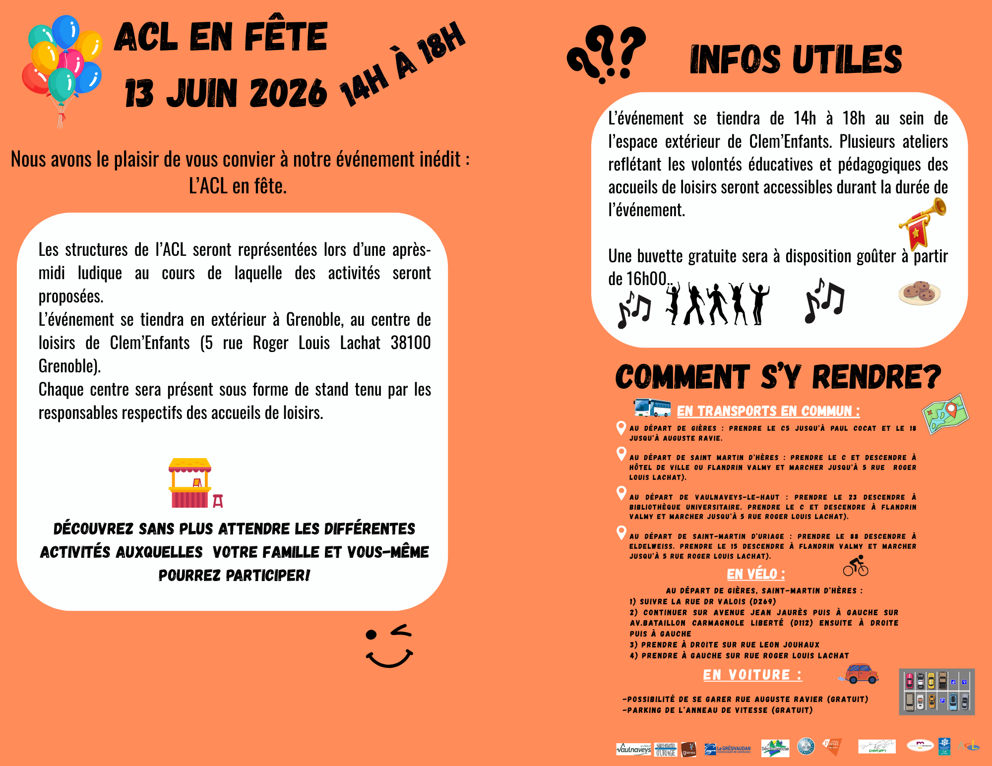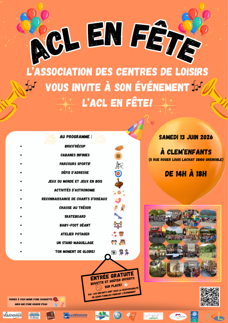 Vous trouverez le programme de l’ACL en fête qui se déroulera le samedi 13 juin 2026 de 14h00 à 18h00 au sein de l’espace extérieur de l’accueil de loisirs de Clem’enfants (5 rue Roger Louis Lachat ) à Grenoble :